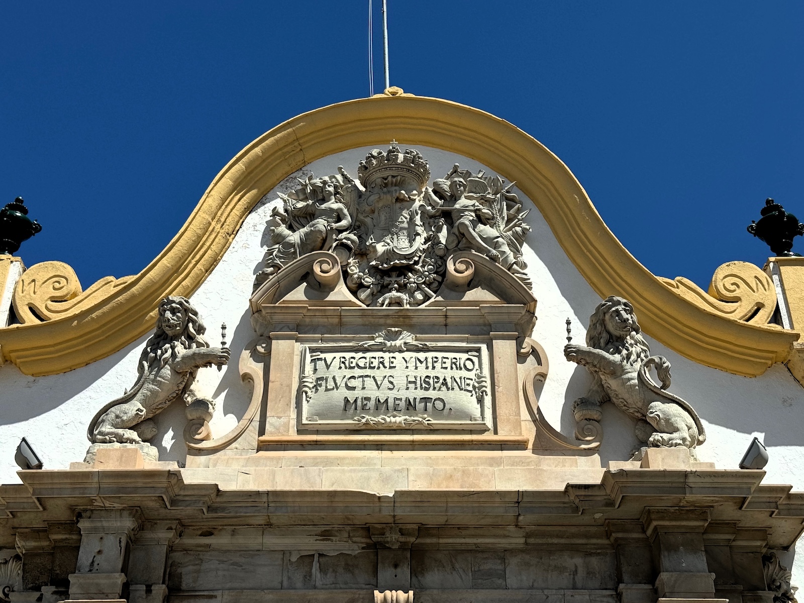 Y dejo para el final a la gran protagonista, al menos para mí, de la visita, la espléndida, la monumental Puerta del Mar, para muchos el monumento más bello de San Fernando, en cambio de los más desconocido al estar dentro de una base militar. Corona la elegante y armoniosa puerta el lema "TV REGERE YMPERIO FLVCTVS. HISPANE MEMENTO" cuya traducción más popular es "RECUERDA ESPAÑA QUE TŨ REGISTE EL IMPERIO DE LOS MARES" pero que la filóloga clásica María Elena Martínez Rodríguez de Lema corrige diciendo que la traducción correcta es "ESPAÑOL, RECUERDA GOBERNAR LOS MARES CON TU AUTORIDAD". Cualquiera de las dos me vale como buen recordatorio. Aunque solo fuera por esa puerta y por estos recordatorios, merece la pena la visita.